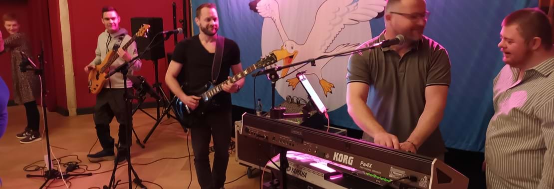 Bandet stod helt bevidst på gulvet og ikke oppe på scenen, så de bedre kunne være nærværende med gæsterne. Det var godt tænkt. Og det virkede.